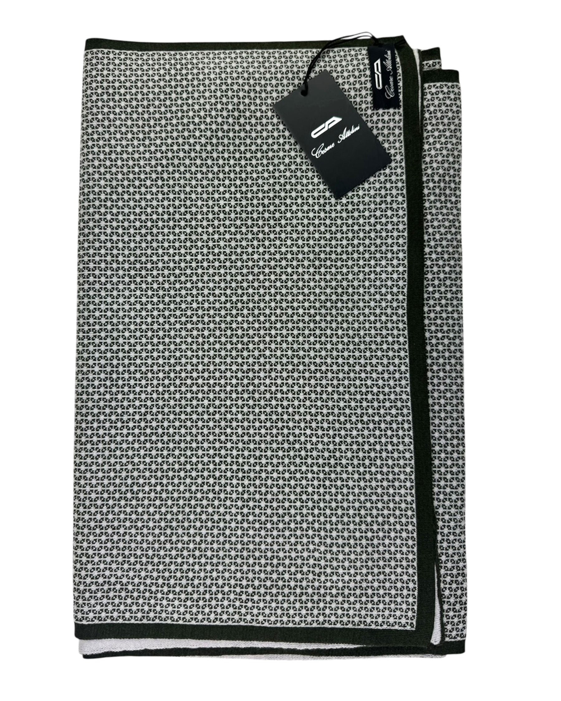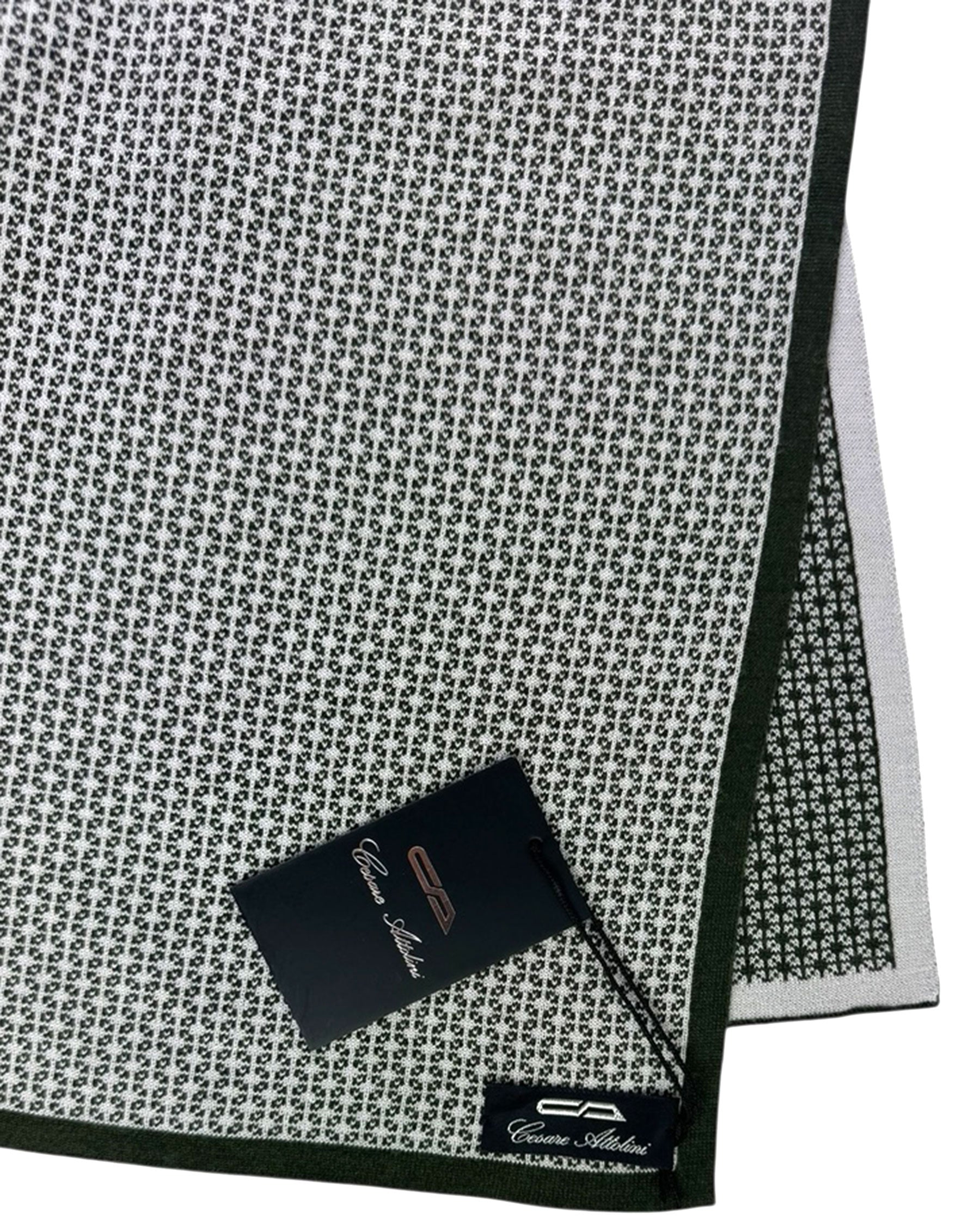 Authentic Cesare Attolini scarf, dark green with light gray geometric design, inverted reverse colors, no fringe, fancy medium weight wool/ silk, made in Italy. Cesare Attolini: sartorial quality men designer shawls and scarves, men collection at outlet prices. Shop discount Attolini scarves.