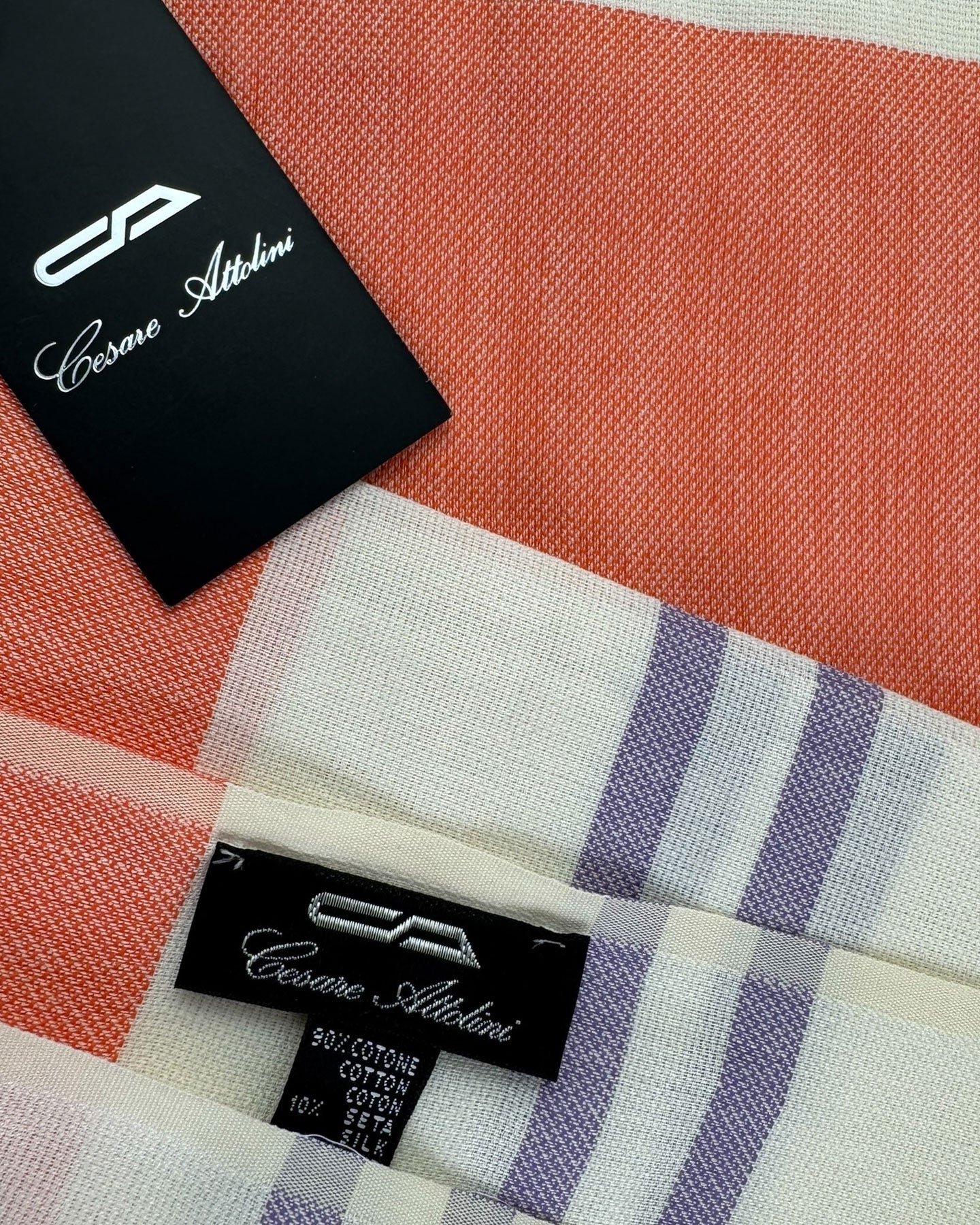 Summer collection: Genuine Attolini scarf, white peach-pink and lilac stipres design, eyelash short fringe, lightweight cotton, made in Italy. Cesare Attolini: sartorial quality designer shawls and scarves at outlet prices.