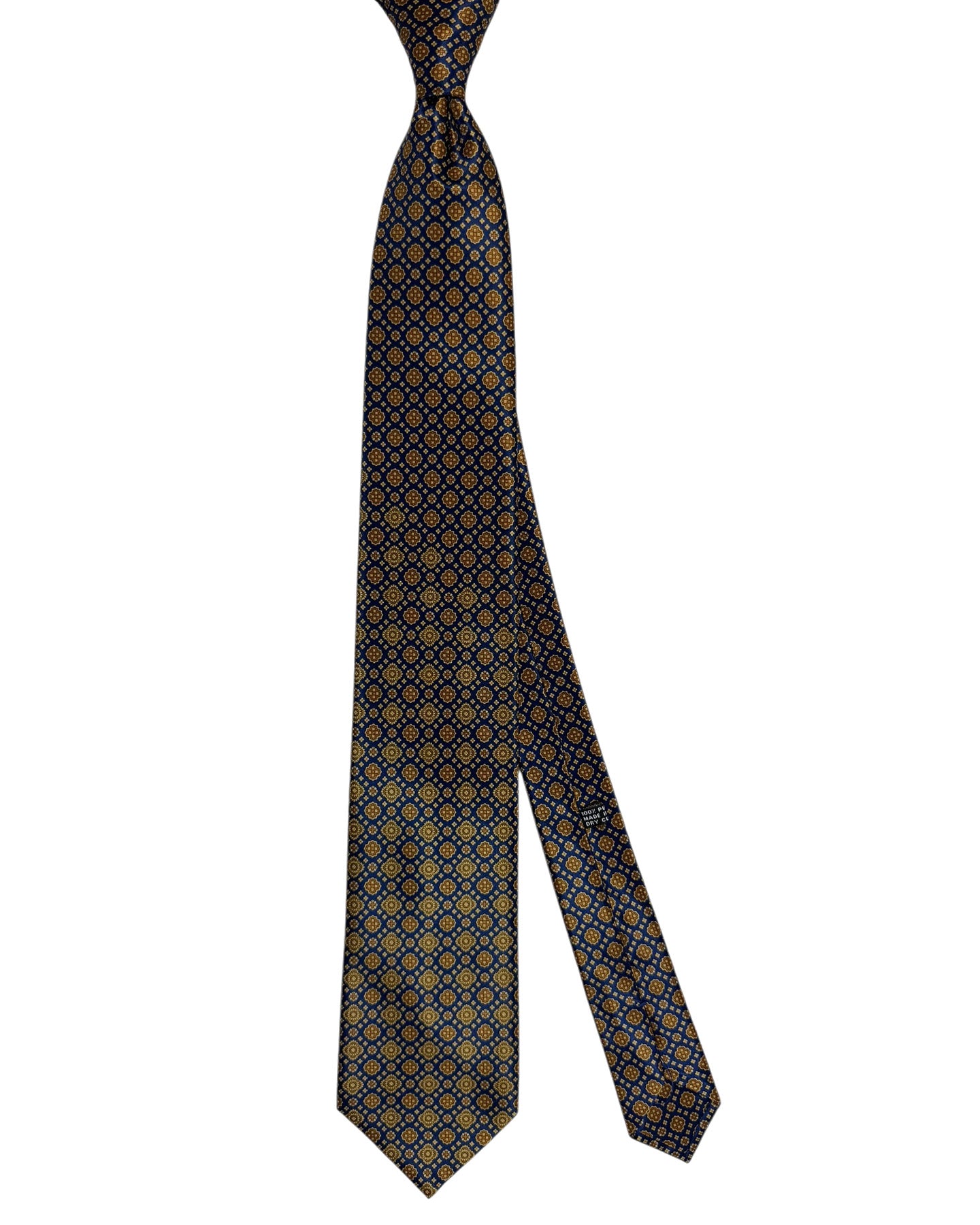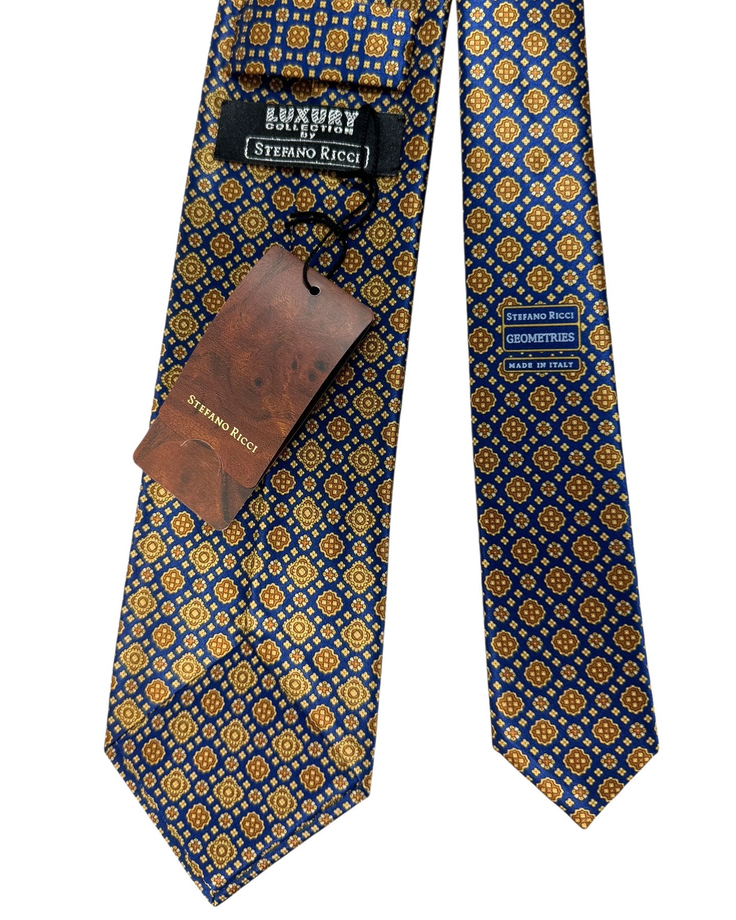 Authentic Stefano Ricci tie, midnight blue mustard brown Geometries pattern, hand printed silk, hand made in Italy. Original Stefano Ricci ties at outlet prices. Discount luxury Italian men ties and accessories.