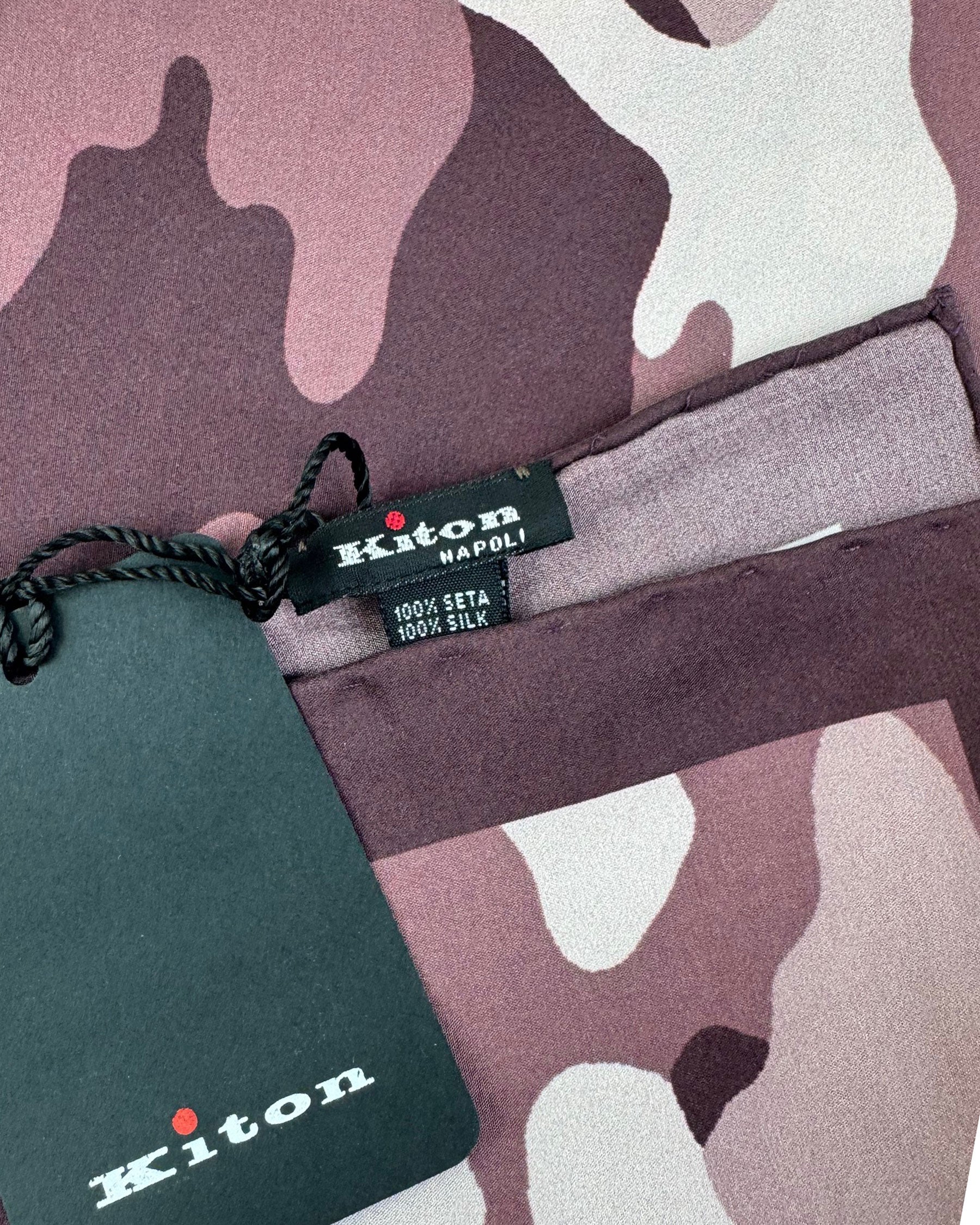 Authentic Kiton pocket square, silk, brown camo design, hand stitched borders, made in Italy. Genuine Kiton sartorial men's clothing and accessories. Discount designer pocket squares/ hankies, Italian fashion accessories for men.