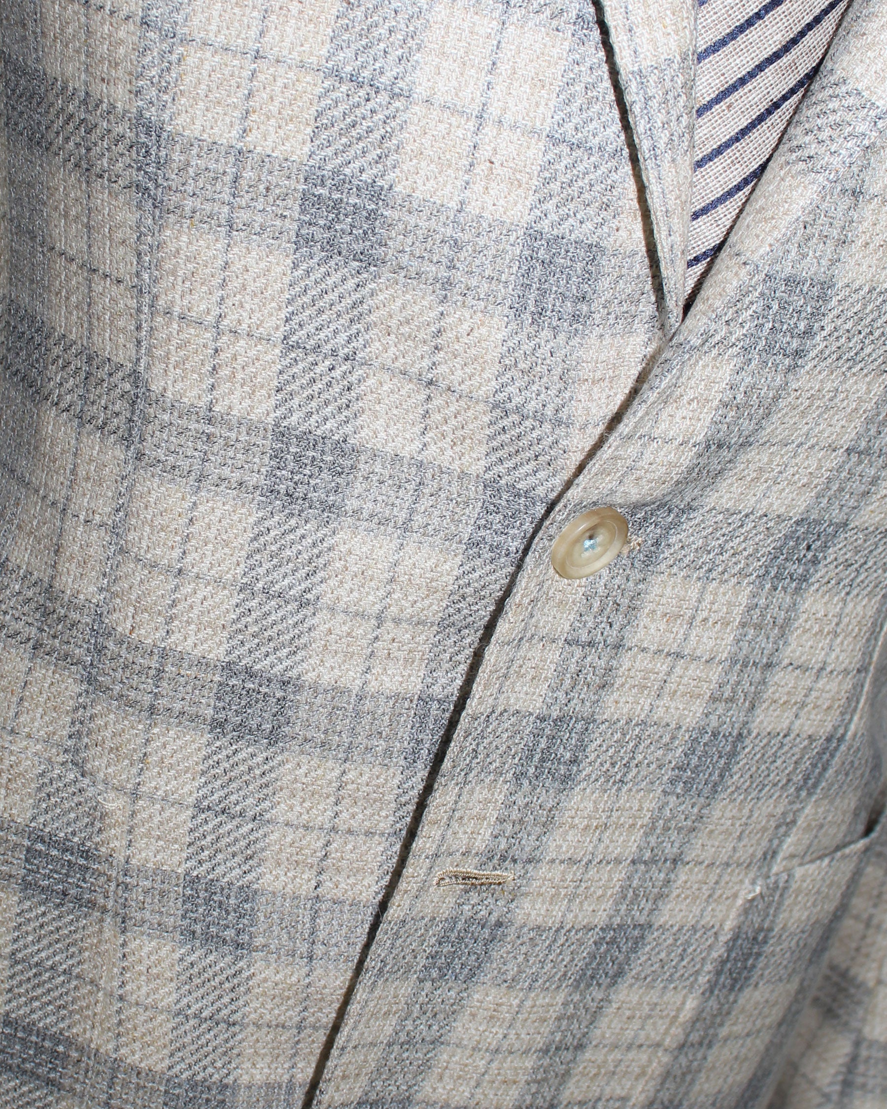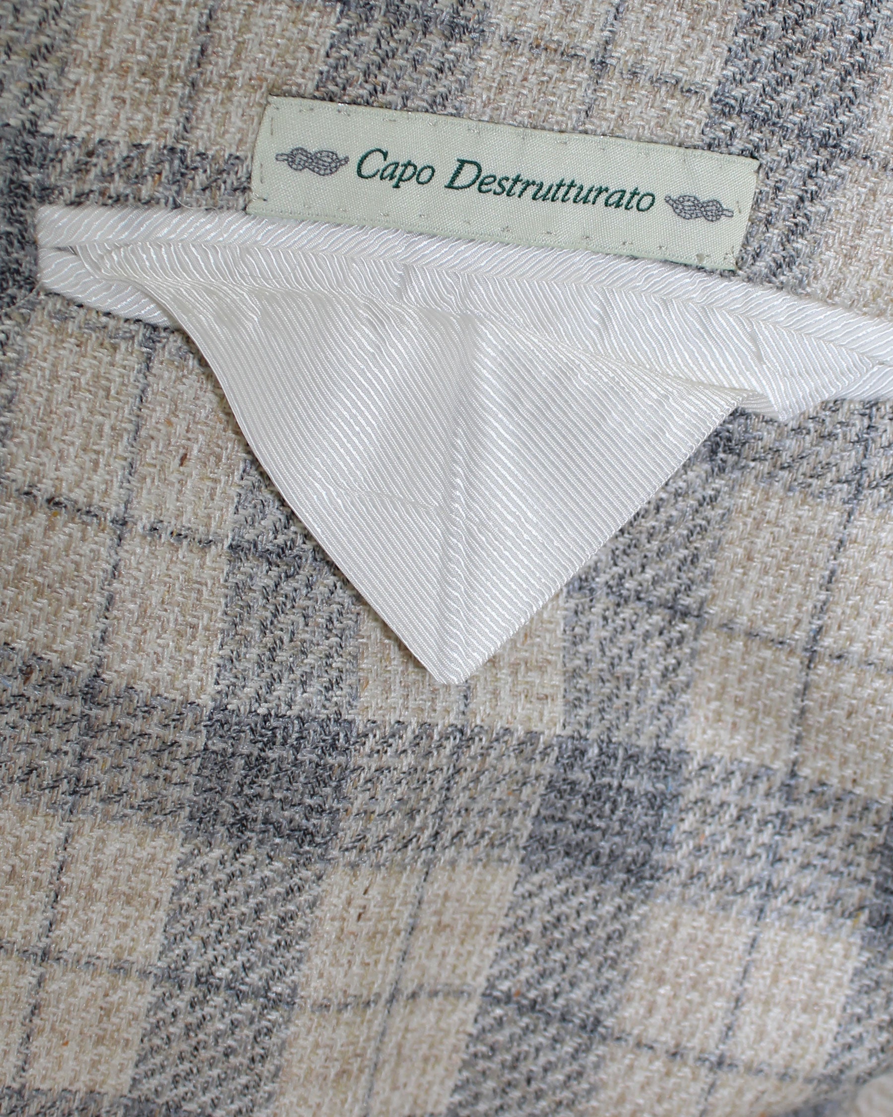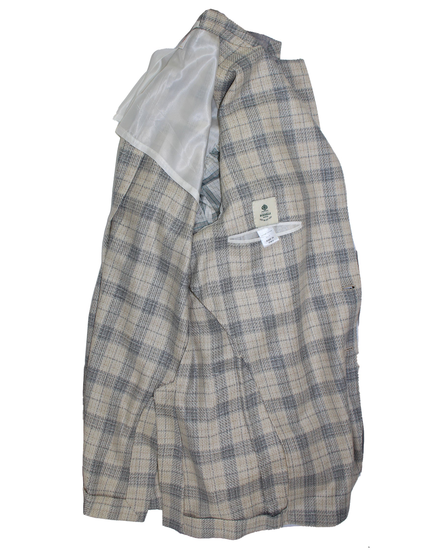 Genuine Luigi Borrelli sport coat, 2 button front, "Capo Destrutturato", gray with off white and little beige check/ plaid design, fancy wool/ silk, unlined, bucket pockets, button cuffs, sartorial, hand made in Italy. Sartorial quality men sport jackets and suits by Luigi Borrelli. Shop Bespoke Sport Coats.