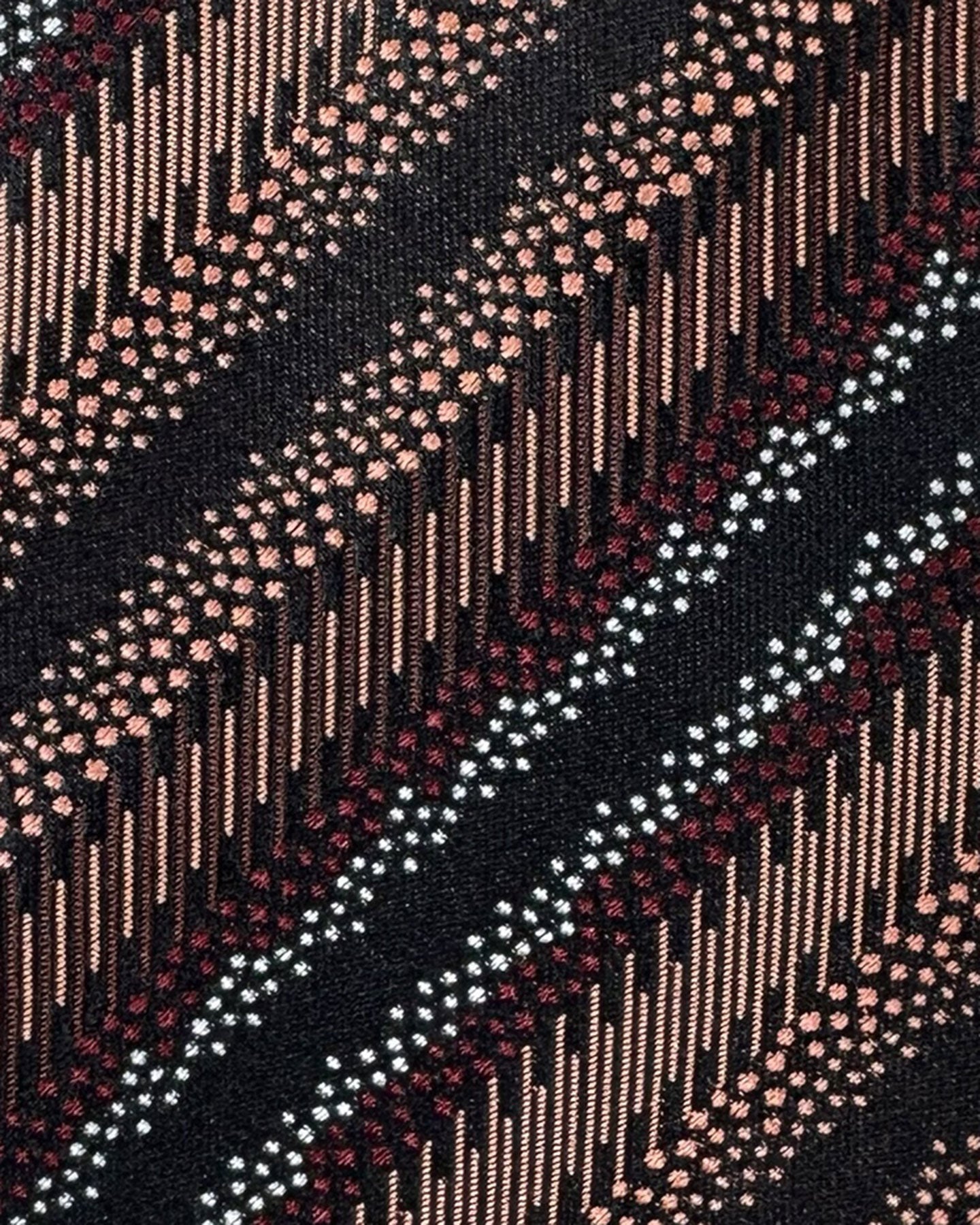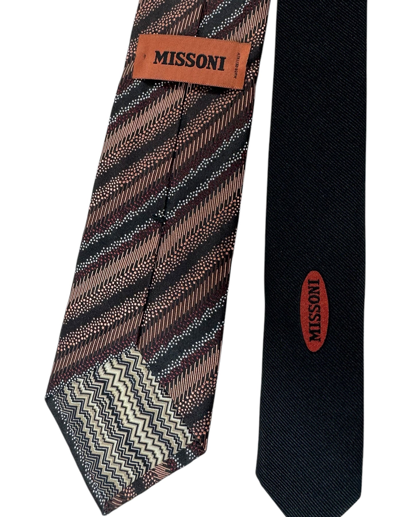 Authentic Missoni tie with light pink/ brown/ multi color patterned stripes, jacquard silk, hand made in Italy. Genuine Missoni men collection neckties/ accessories at outlet prices online.