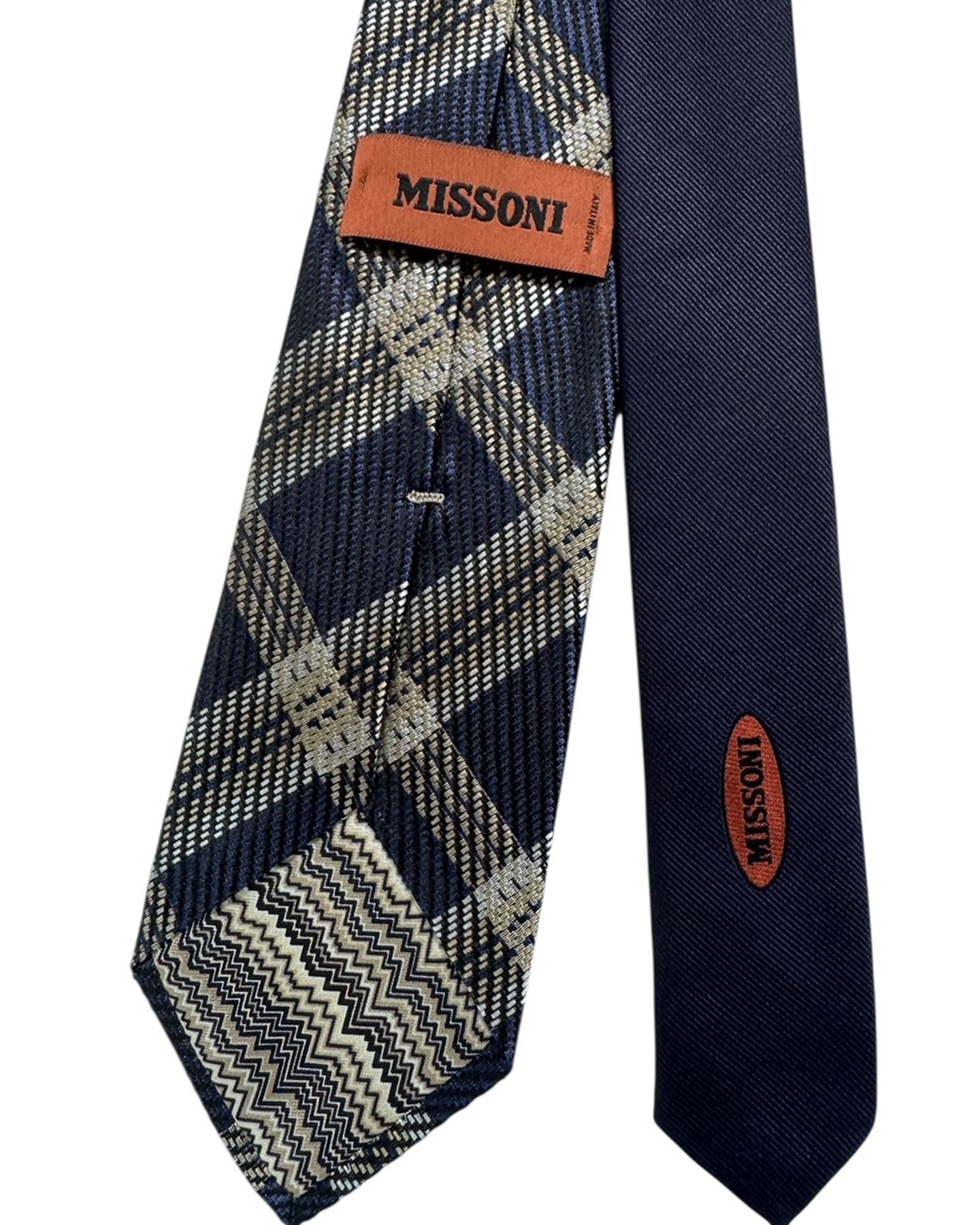 Authentic Missoni tie, navy base woven with a beige and silver plaid pattern , jacquard silk, hand made in Italy. Genuine Missoni men collection neckties/ accessories at outlet prices online.