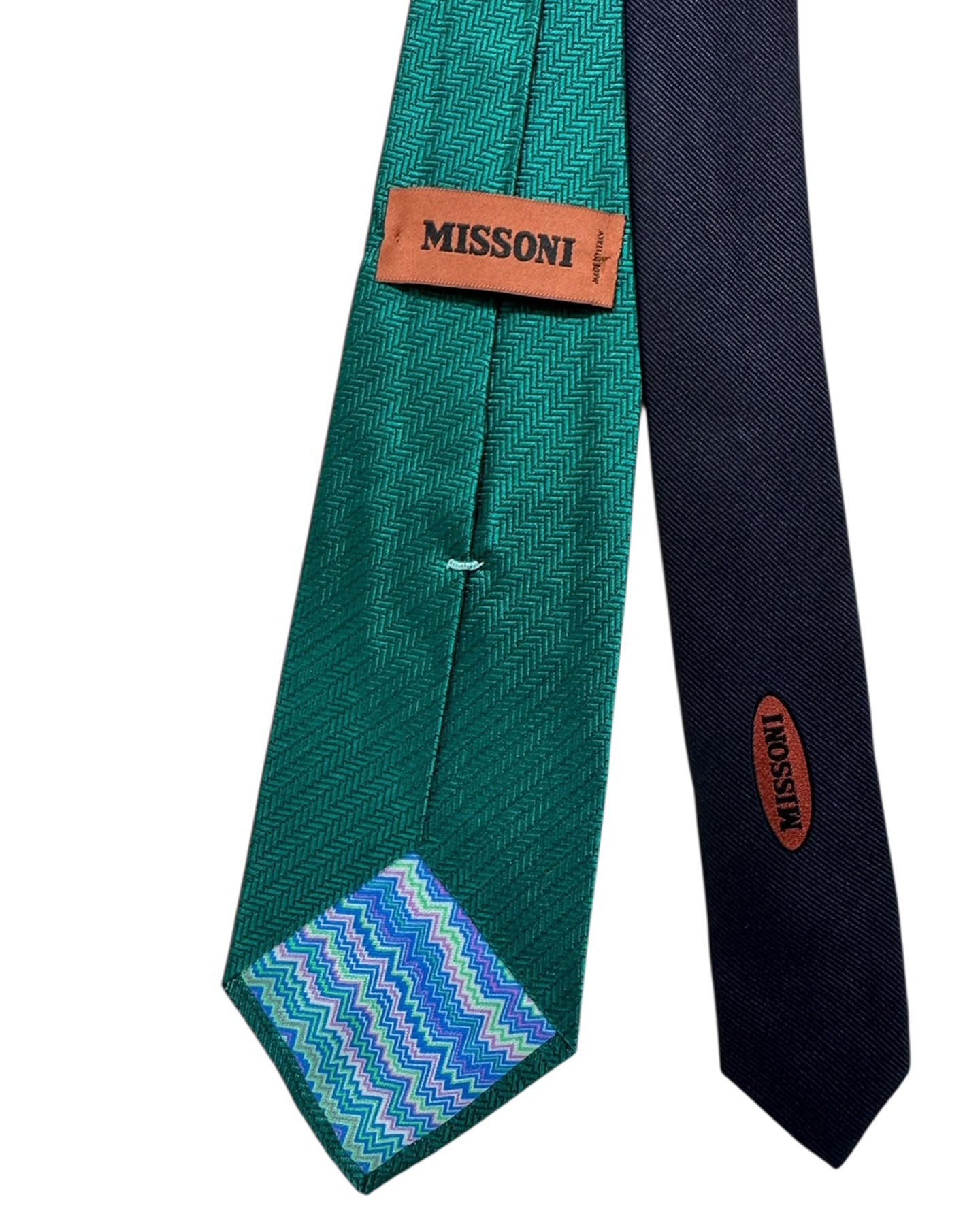 Authentic Missoni tie, emerald green tone solid woven in a subtle herringbone pattern , jacquard silk, hand made in Italy. Genuine Missoni men collection neckties/ accessories at outlet prices online.