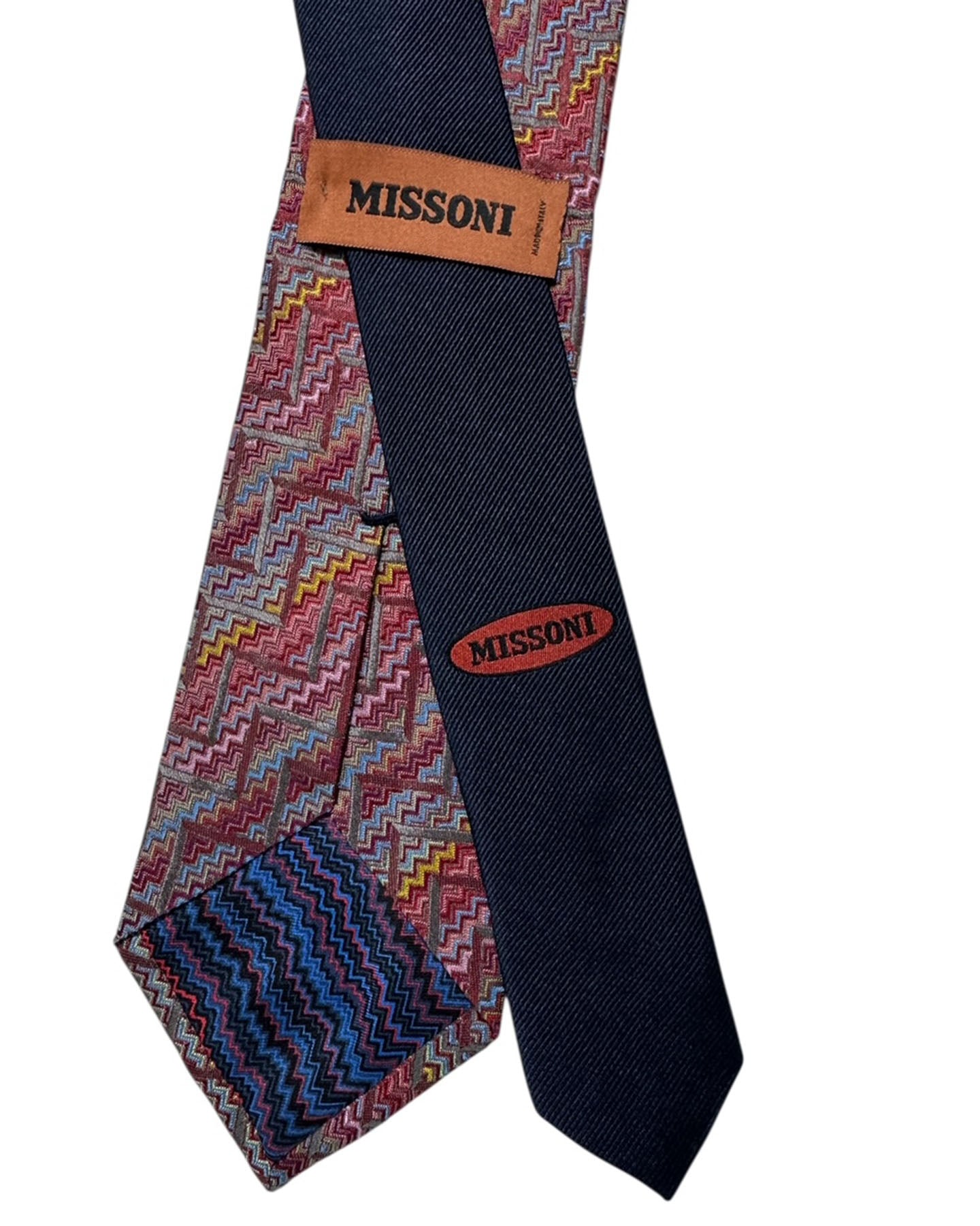 Authentic Missoni tie, pink gray blue chevron pattern, jacquard silk, hand made in Italy. Genuine Missoni men collection designer neckties/ accessories at outlet prices online.