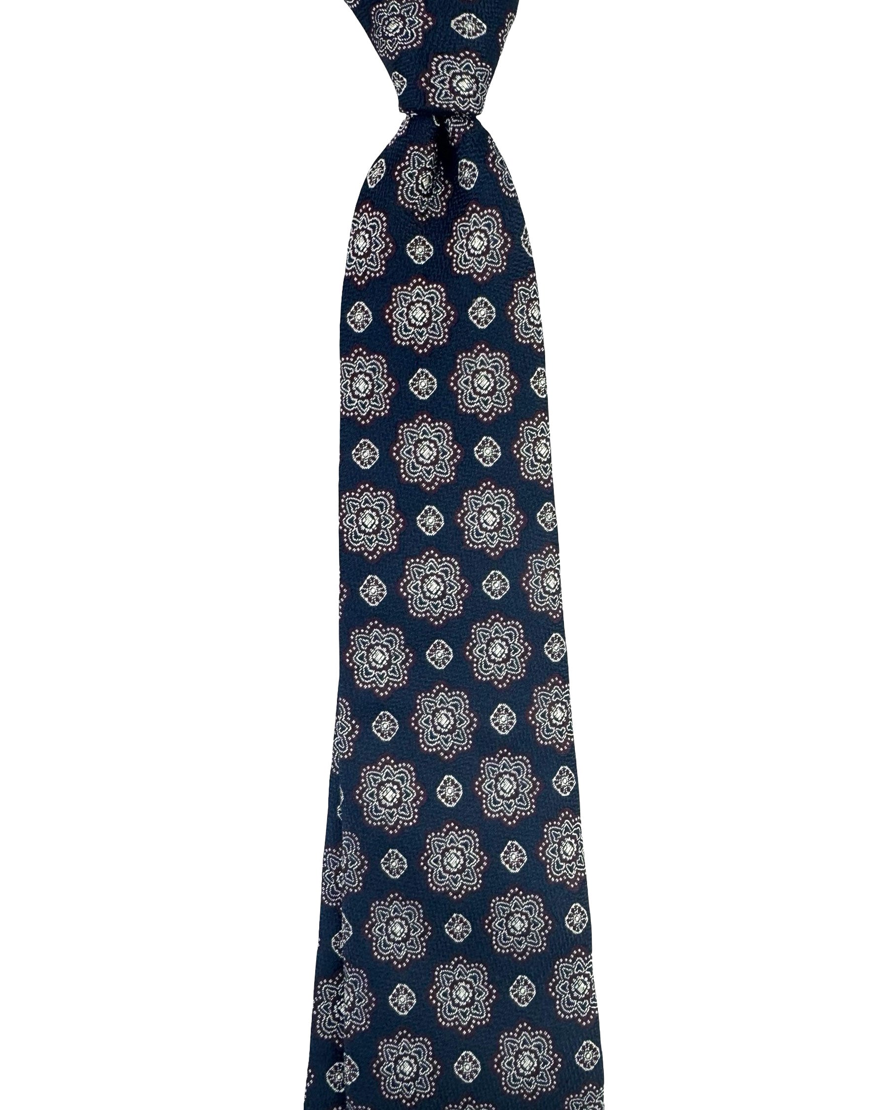 Authentic Brunello Cucinelli tie, dark navy purple silver geometric flowers design, jacquard silk, men collection, hand made in Italy. Genuine Brunello Cucinelli men fashion accessories, ties, the best fabrics and sartorial craftsmanship. Shop Brunello Cucinelli square end ties.