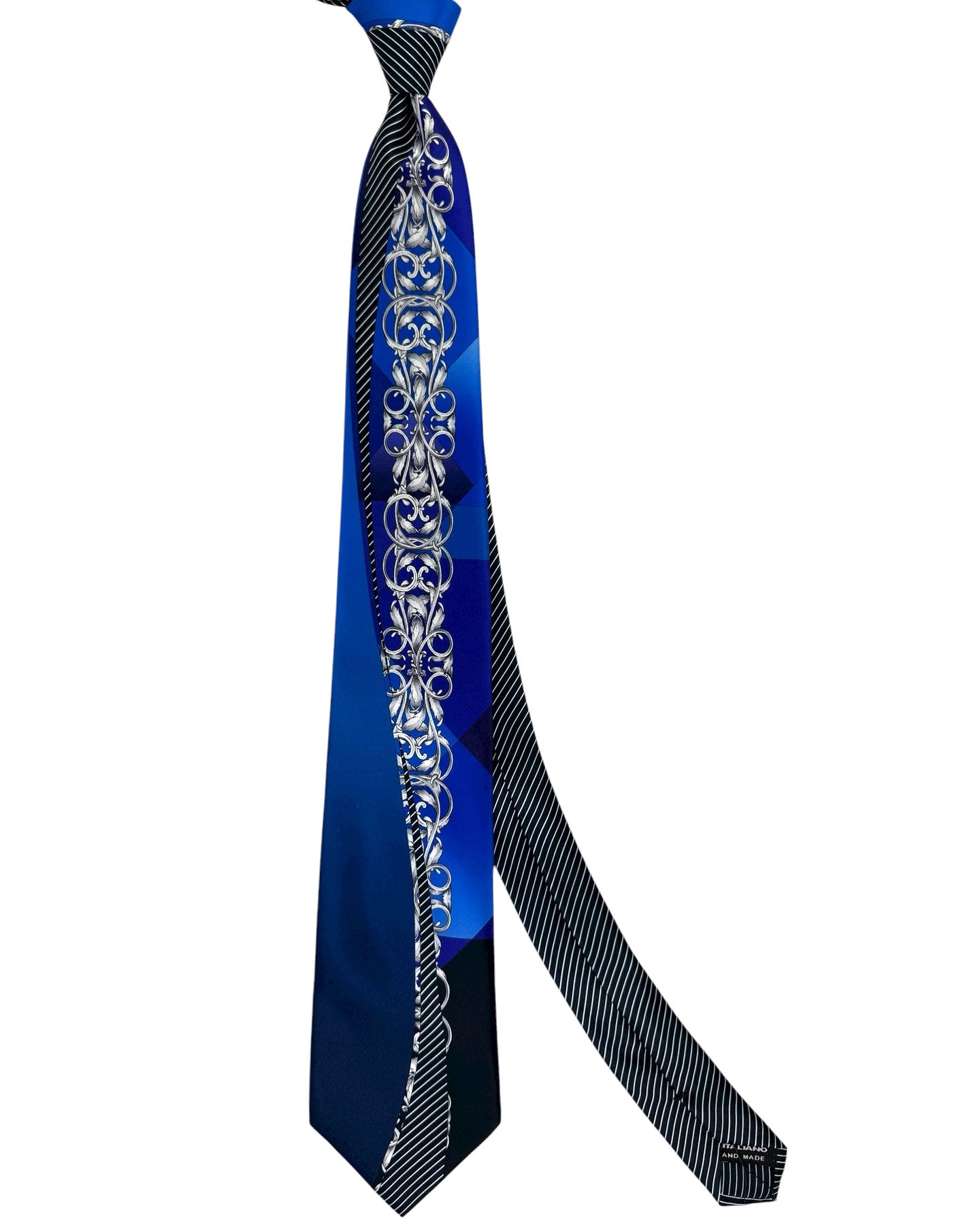 Authentic Vitaliano Pancaldi tie, black royal blue with gray-silver ornamental design, fancy printed silk, hand made in Italy. Genuine Vitaliano Pancaldi ties are luxury Italian designer neckties. Shop all Vitaliano ties.