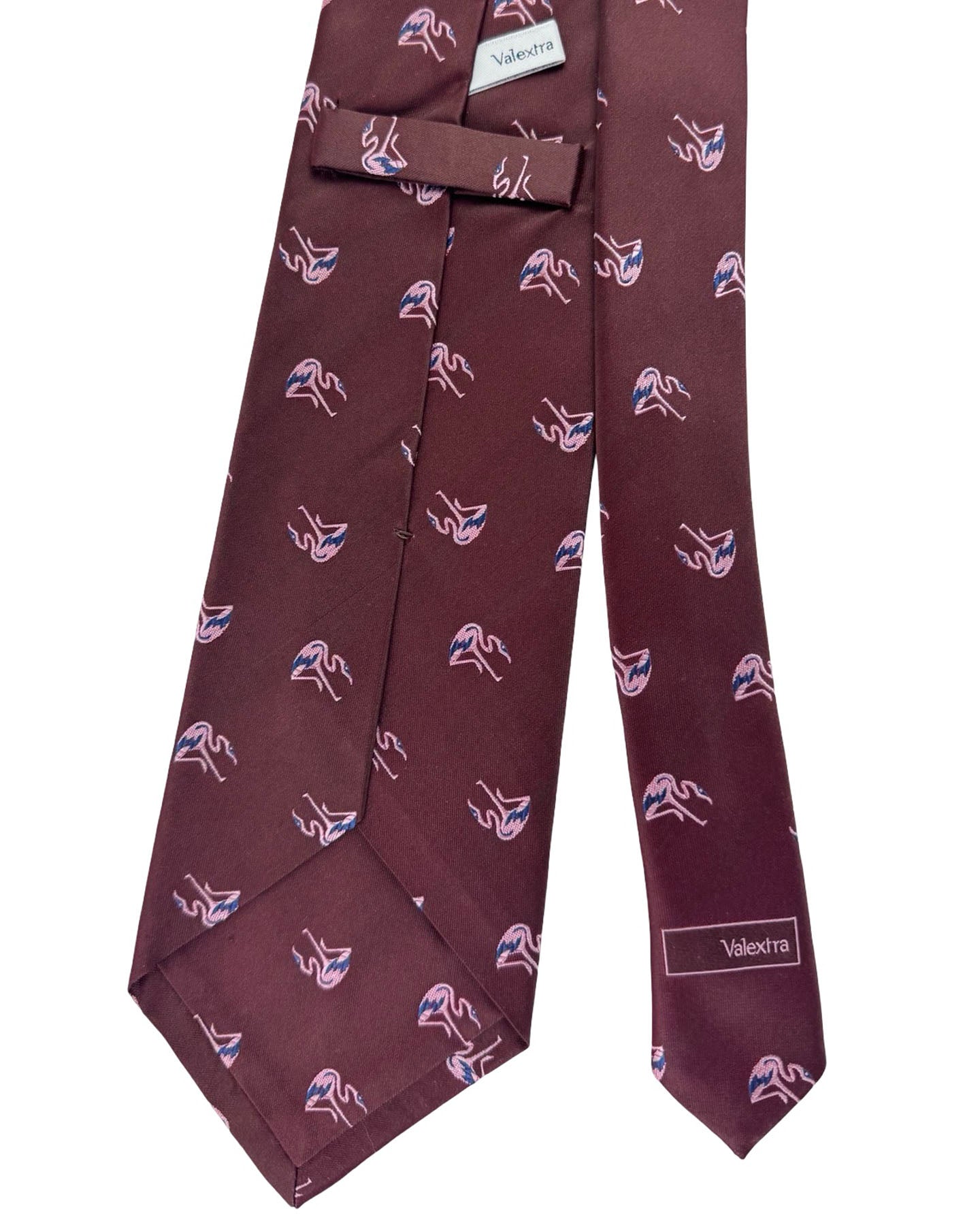 SALE - Genuine Valextra tie, burgundy brown background with pink flamingo, wide 9.5cm width, silk, self tipped, high quality, hand made in Italy. Discount luxury designer ties, Valextra men fashion accessories at outlet prices.