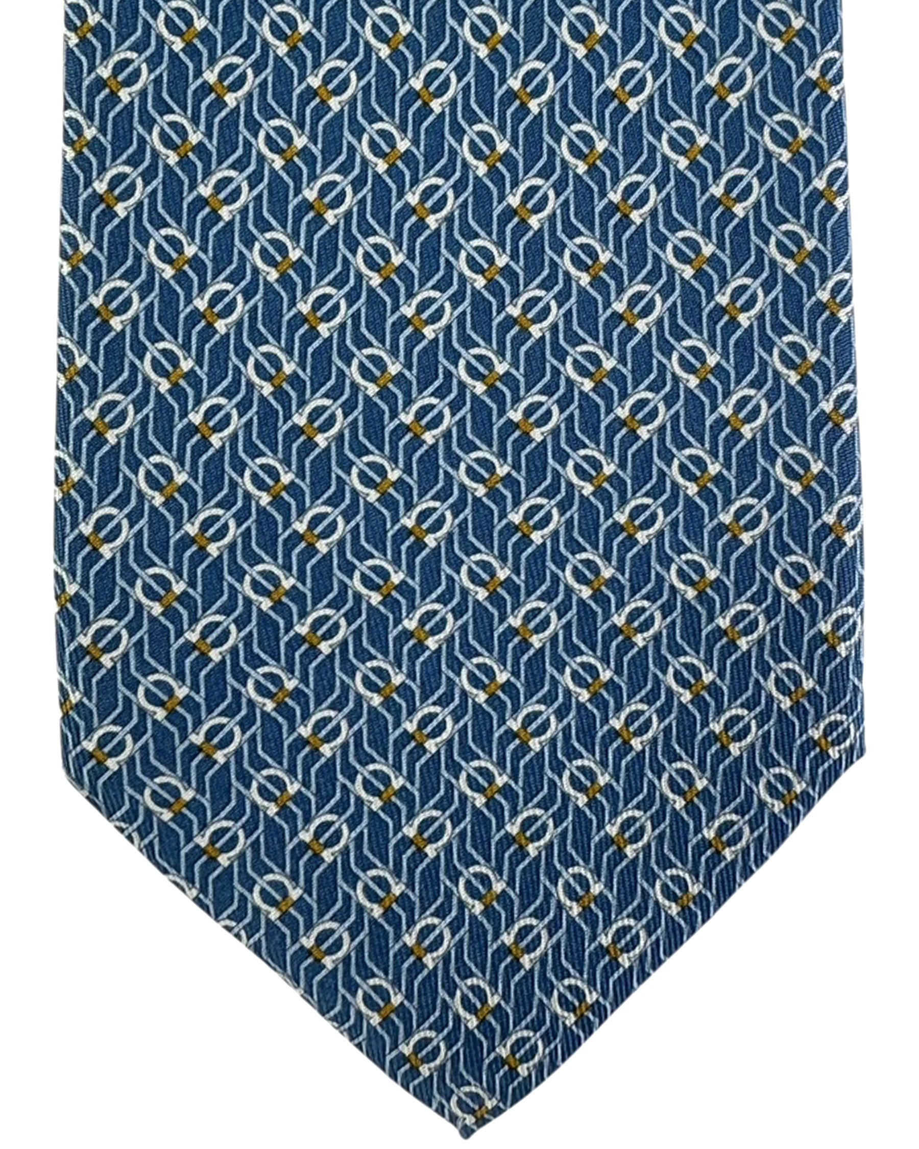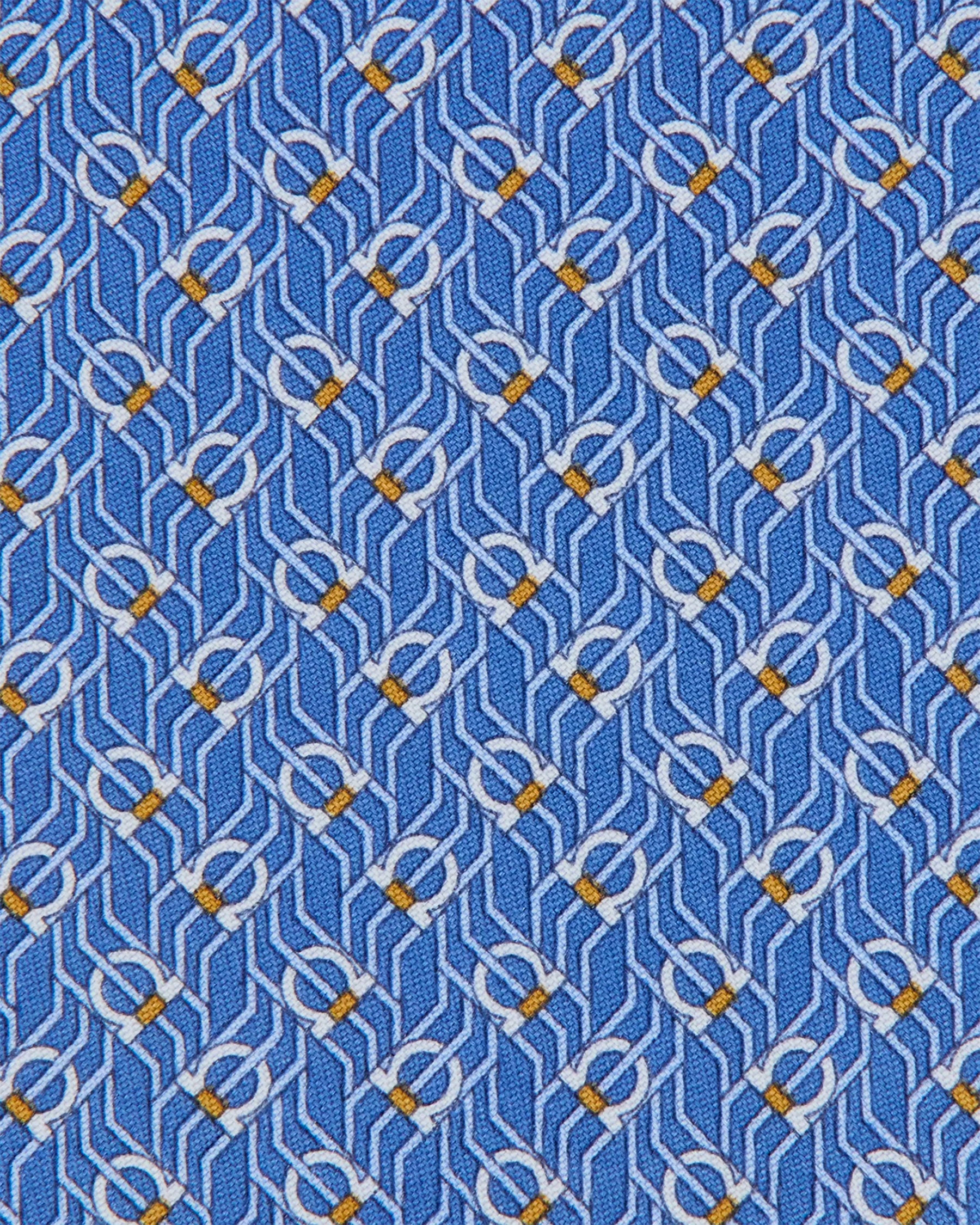New Fall/ Winter 2025/ 2026 Collection: Authentic Salvatore Ferragamo tie, blue, the iconic Gancini Tetris pattern, printed silk, hand made in Italy. Genuine discount Ferragamo ties online, Ferragamo men collection at outlet prices. The most popular high-end novelty tie in the world.