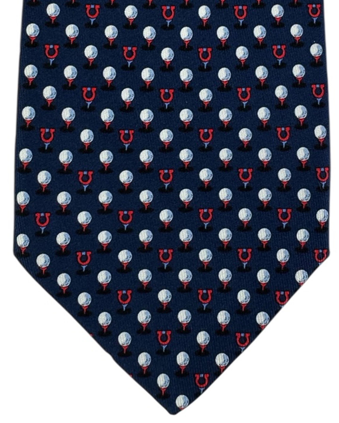 New Fall/ Winter 2025/ 2026 Collection: Authentic Salvatore Ferragamo tie, midnight blue golf ball/ tee & Gancini novelty design, printed silk, hand made in Italy. Genuine discount Ferragamo ties online, Ferragamo men collection at outlet prices.