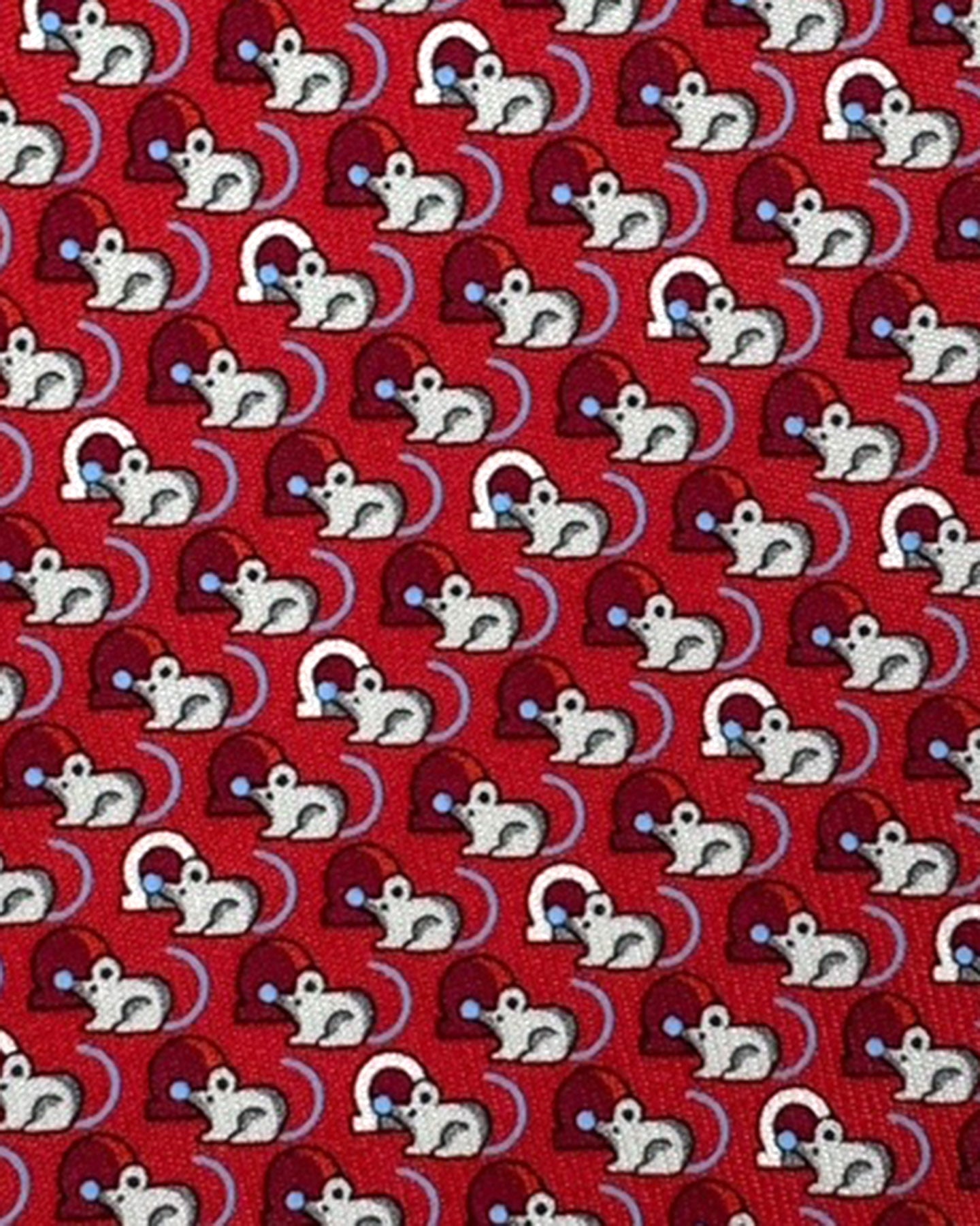 Authentic Salvatore Ferragamo tie, red mouse novelty design, printed silk, hand made in Italy. Original Salvatore Ferragamo ties online, men collection. Colors: Red