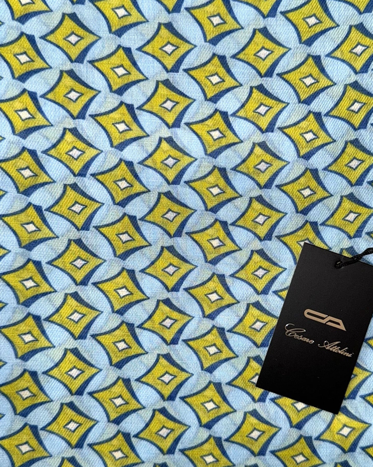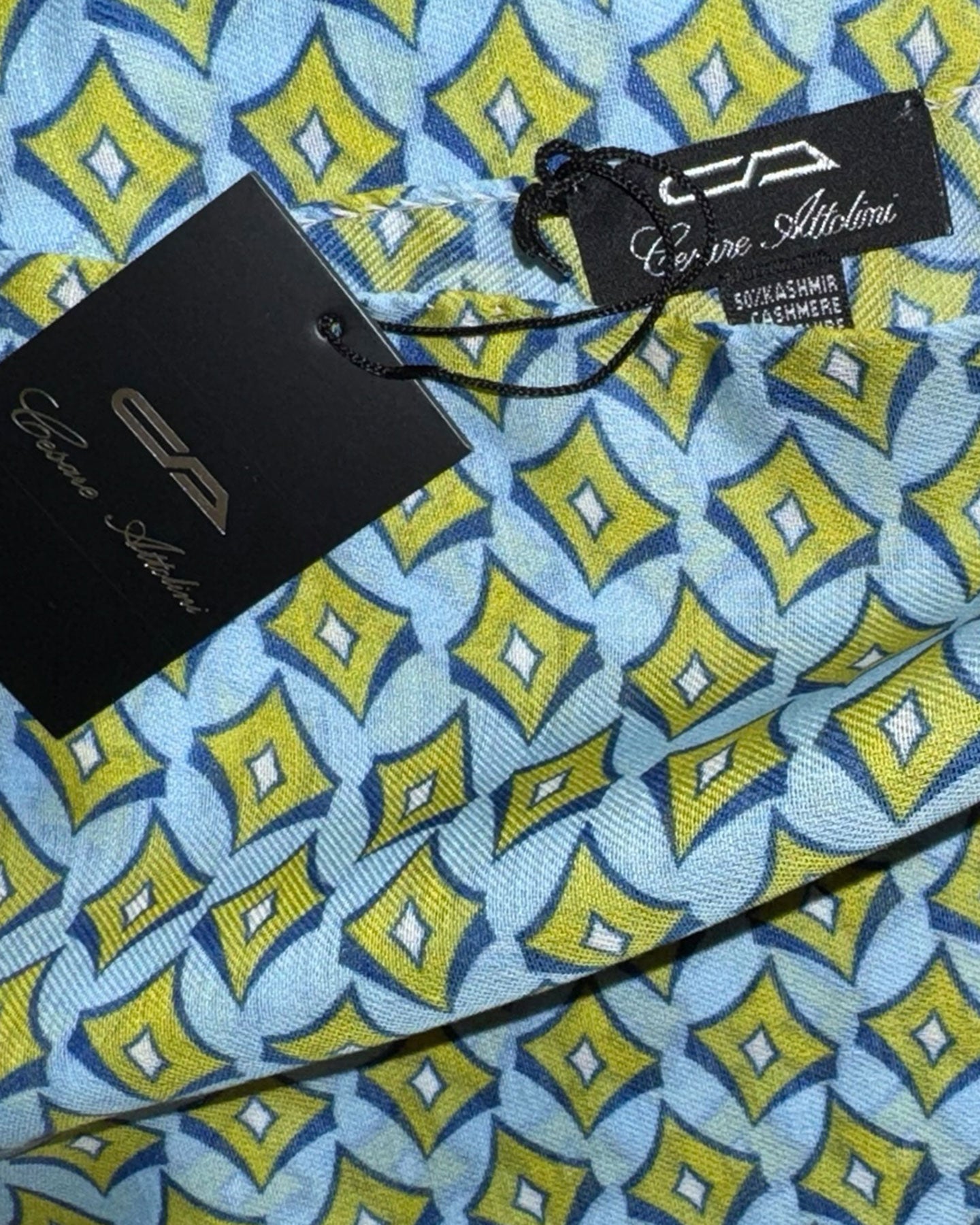 Summer collection: Genuine Attolini scarf, sky blue olive navy geometric design, eyelash short fringe, lightweight cotton cashmere, made in Italy. Cesare Attolini: sartorial quality designer shawls and scarves at outlet prices.