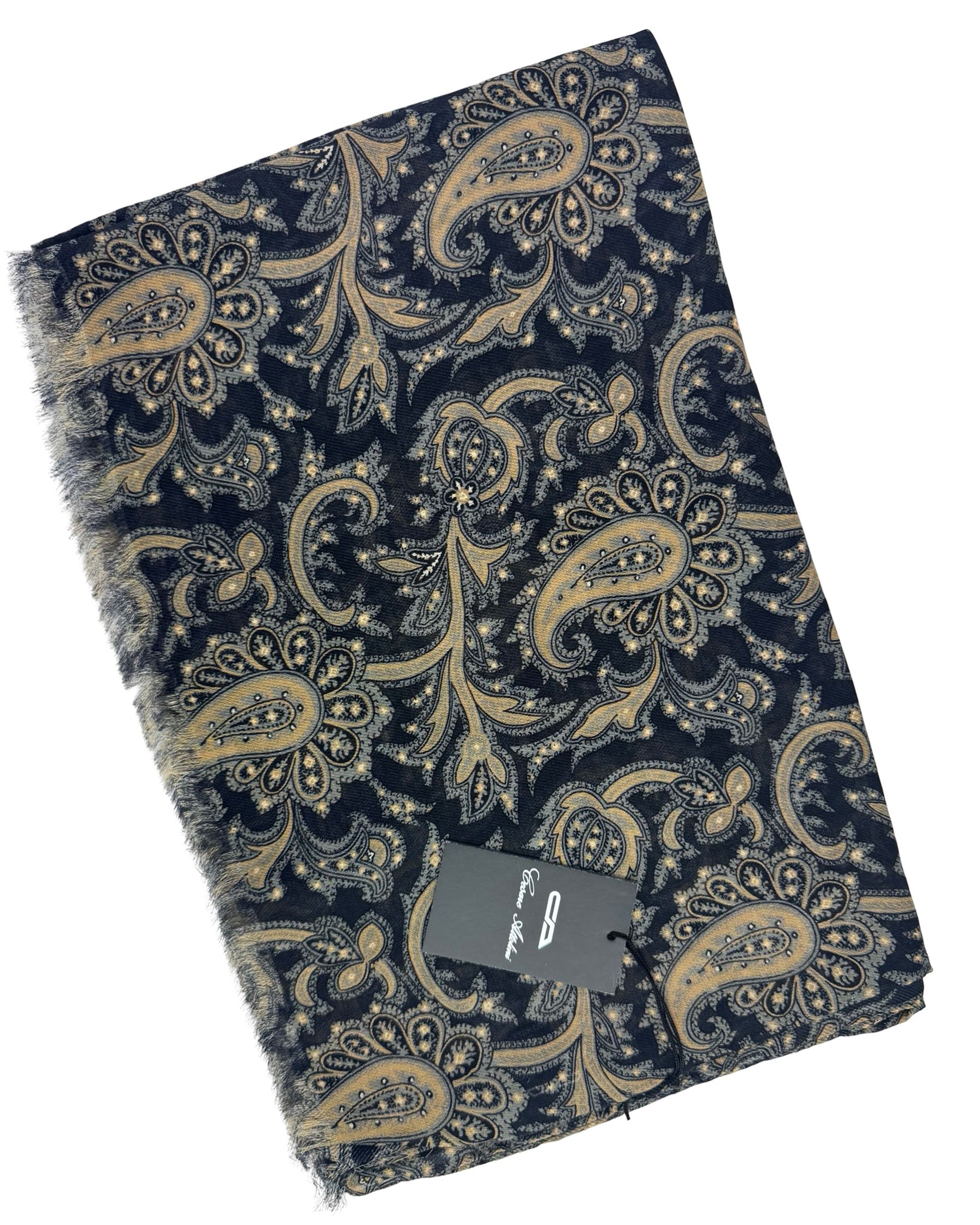 Genuine Attolini scarf, midnight blue taupe paisley design, cashmere/ cotton, short eyelash fringe, made in Italy. Authentic Cesare Attolinimen accessories at outlet prices. Shop discount Attolini scarves.