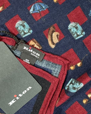 Authentic Kiton scarf, cashmere, navy maroon novelty design, small square scarf, made in Italy. Luxury Kiton men collection scarves, wraps and shawls.
