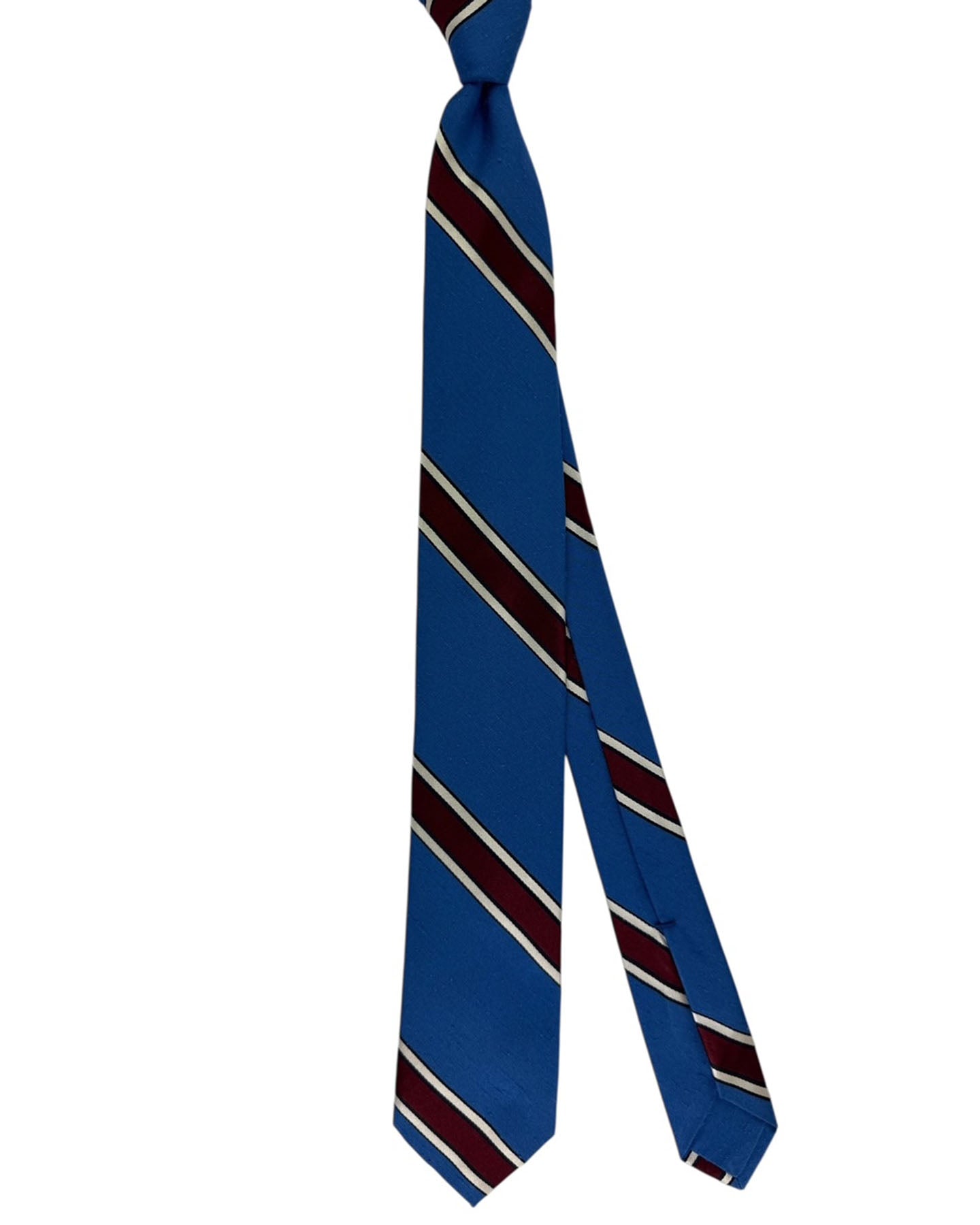 Authentic Barba sevenfold tie, blue maroon striped striped design, "raw" silk, sevenfold construction, hand made in Italy. Stylish, elegant and sophisticated, genuine Barba Napoli ties, sartorial tailoring, hand made in Italy, dapper men fashion.