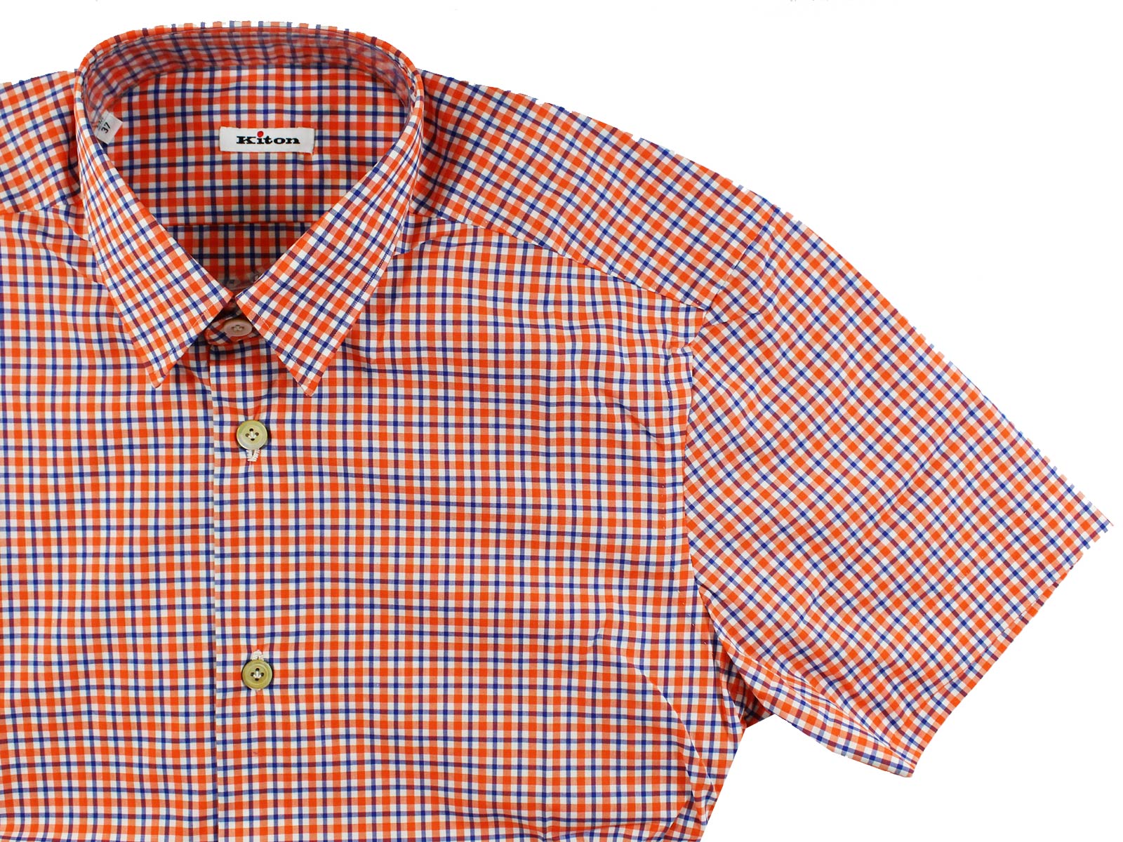 SALE - Genuine Kiton shirt, short sleeve, white/ orange/ royal blue check design, fancy cotton, mother of pearl buttons, hand made in Italy.  Discount Kiton men dress shirts online. Shop for an excellent selection of sartorial quality Kiton dress shirts at outlet prices.