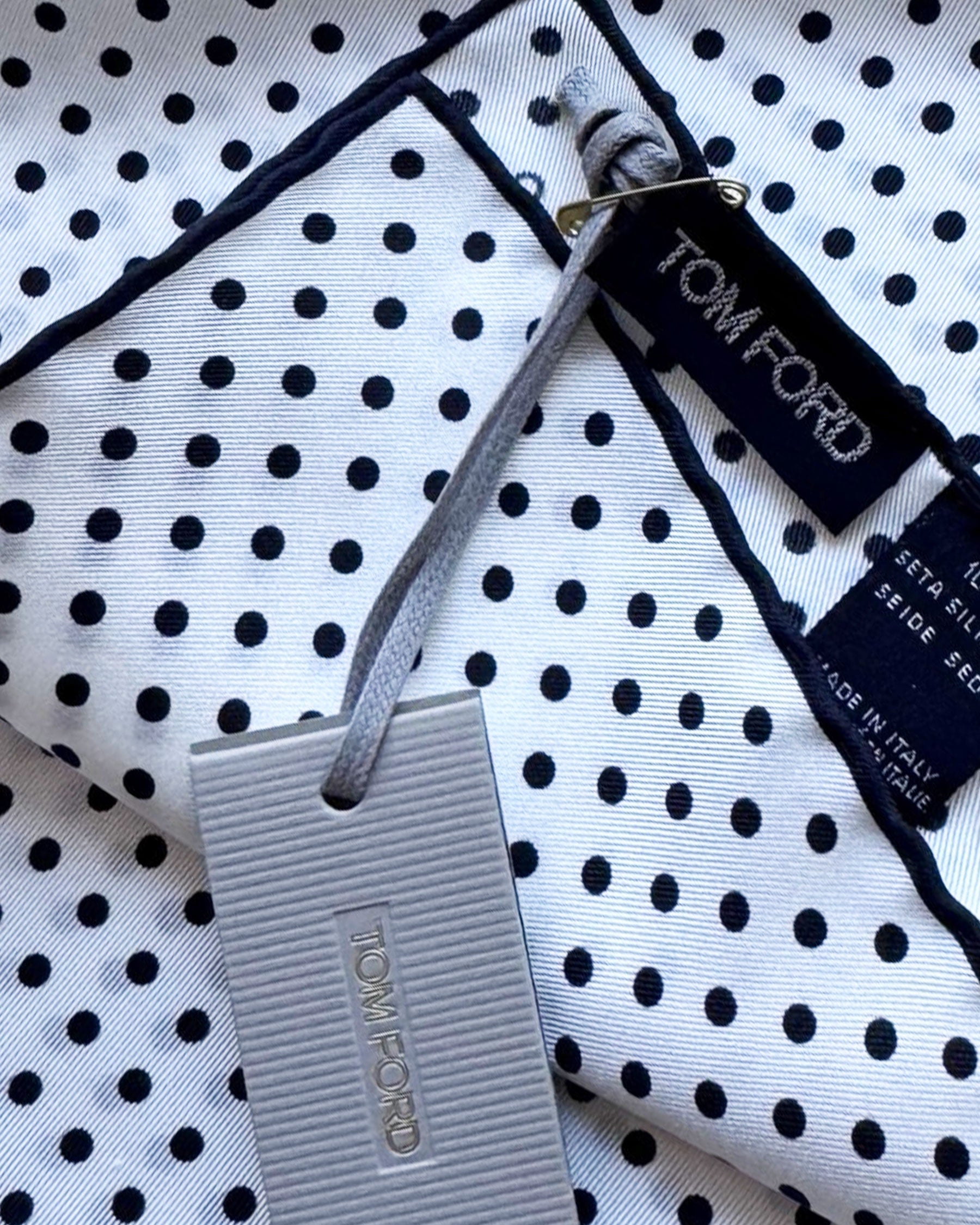 Genuine Tom Ford silk pocket square, white black dots design, hand stitched border, hand made in Italy. Authentic Tom Ford men collection online at outlet prices. Shop Tom Ford pocket squares.