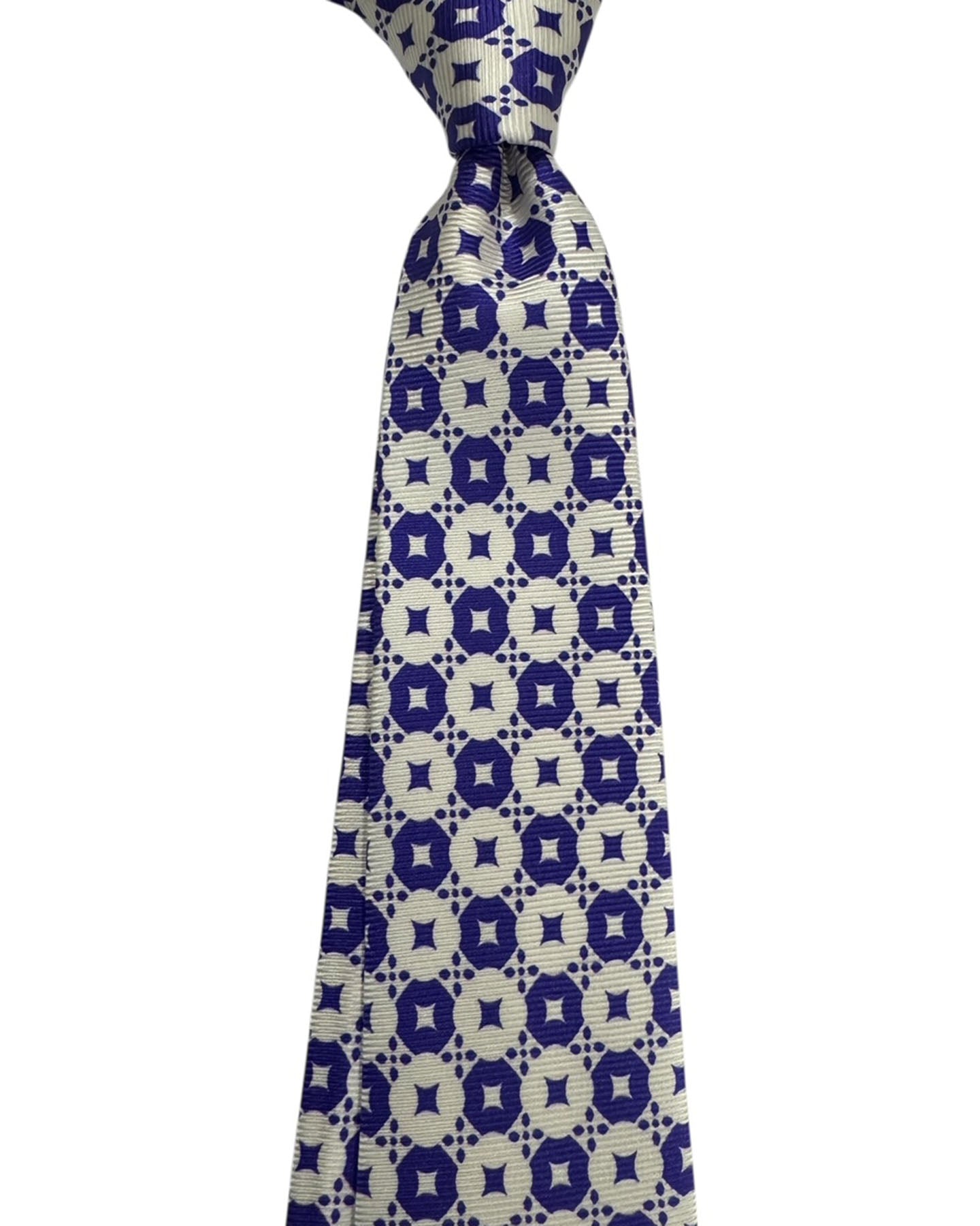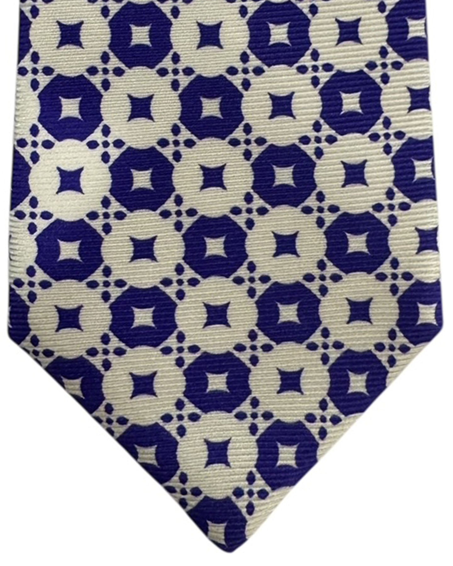 Authentic Kiton tie, navy silk necktie featuring a striking geometric pattern of interlocking circles and star shapes in cream and navy, printed silk, hand made in Italy. Genuine Kiton ties, luxury men accessories, dress shirts and suits: sartorial quality.