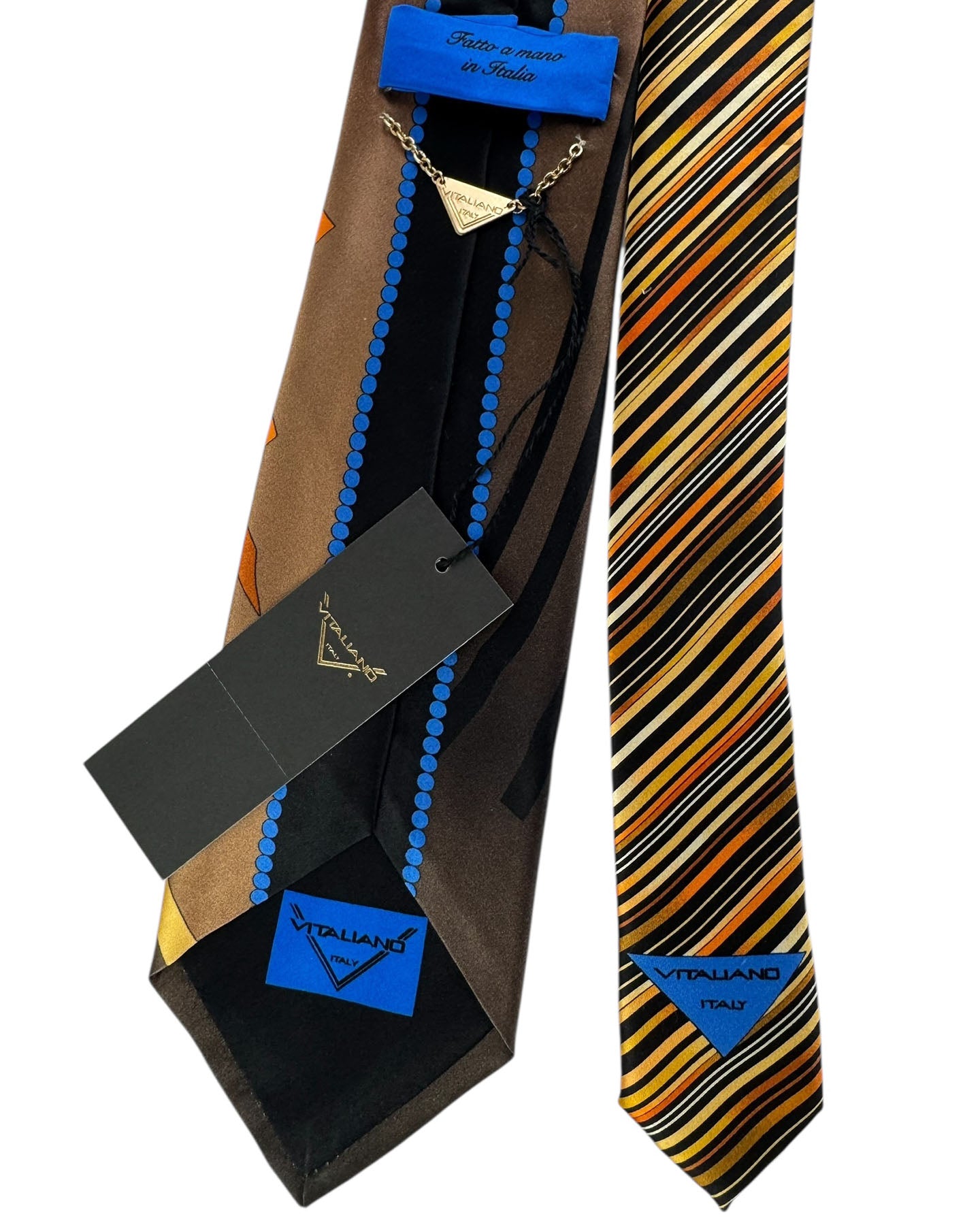 Authentic Vitaliano Pancaldi tie, brown swirls in gold, orange, and taupe creating a flowing, wave-like design, hand made in Italy. Genuine Vitaliano Pancaldi ties are luxury Italian designer neckties. Shop all Vitaliano ties.